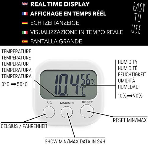✅ Hoge nauwkeurigheid: de thermo-hygrometer van Takit biedt een groot meetbereik dat de temperatuur tussen 0,0 °C en 50,0 °C (32,0 °F tot 122,0 °F). Het meetbereik van de temperatuur bedraagt ± 1 °C (± 1,8 °F). De vochtsensor heeft een meetbereik van 10% tot 90%. De meetnauwkeurigheid van de luchtvochtigheid bedraagt ± 5%.