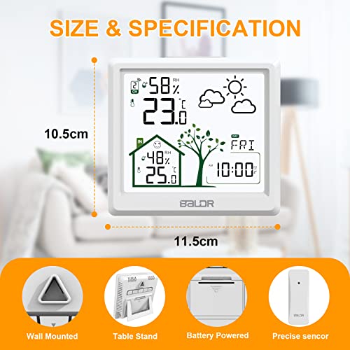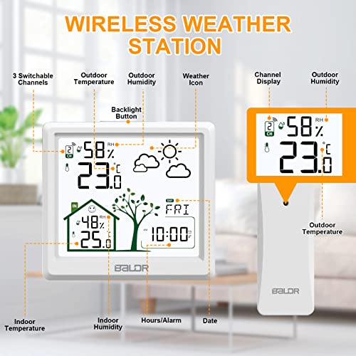 Multifunctioneel weerstation: Het scherm biedt je een kalender (maand/dag of dag/maand kunnen worden gewijzigd), week (7 talen: Engels / Duits / Italiaans / Frans / Spaans / Deens / Nederlands / tijdweergave (omschakelbaar 12 uur/24 uur), binnen- en buitentemperatuur (°C / °F kan worden omgeschakeld), binnen- en buitenvochtigheid, weersvoorspelling voor de komende 12 tot 24 uur (80% nauwkeurigheid), wat je kan helpen om je van tevoren voor te bereiden.
