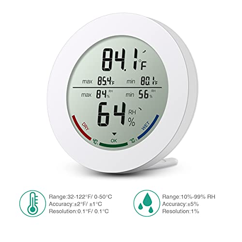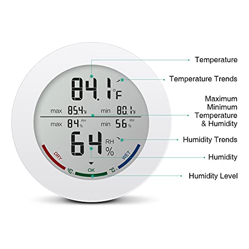 Helder & groot LCD-scherm weergave van temperatuur en vochtigheidswaarden duidelijk en duidelijk. De exacte gegevens (de temperatuur weergaveresolutie bedraagt 0,1 C/0,1 F en de luchtvochtigheid weergaveresolutie bedraagt 1%) met het bijgewerkte ronde glazen LCD-scherm en nauwkeurigheid om de eenheid gemakkelijk en comfortabel af te lezen.