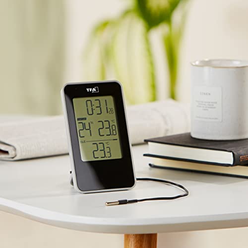 TFA Dostmann digitale thermo-hygrometer, 30.5048.01, met tijd, temperatuur binnen en buiten, met waterdichte kabelsensor, ideaal voor koelkast, diepvriezer, aquarium of buitentemperatuur, zwart