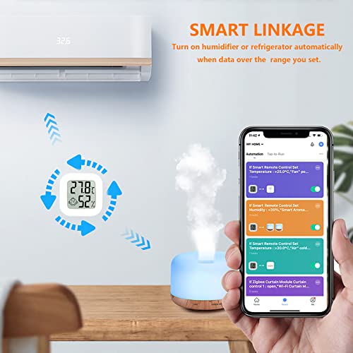 Smart Linkage voor thuis: je kunt met de temperatuurvochtigheidsmonitor een smart home koppeling maken om je intelligente apparaten automatisch in te schakelen. Je kunt bijvoorbeeld een intelligente scène instellen door je airconditioning en luchtbevochtiger te verbinden met de thermometer van de vochtigheidsweergave. Je airconditioning: je luchtbevochtiger wordt automatisch ingeschakeld als de temperatuur of vochtigheidsgegevens boven de kritische waarde waarvoor je hebt ingesteld